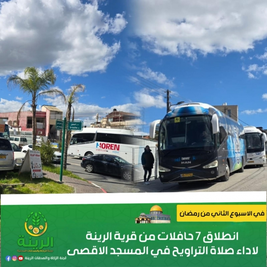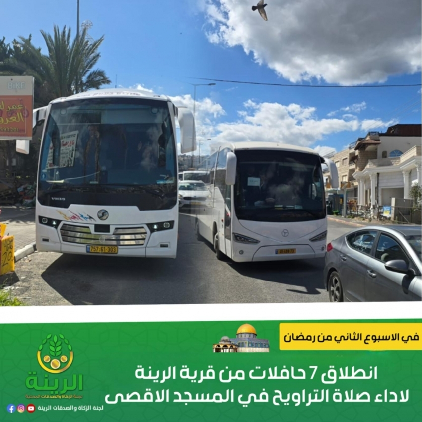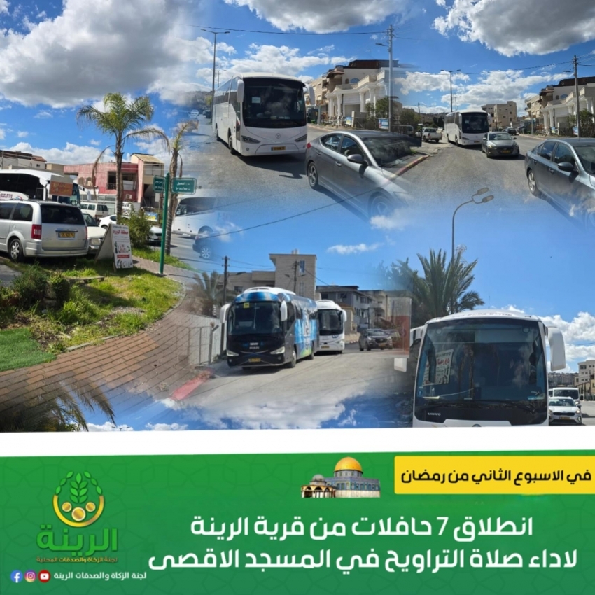 في الاسبوع الثاني من شهر رمضان الفضيل انطلقت 7 حافلات من قرية الرينة لشد الرحال الى المسجد الاقصى المبارك لاداء صلاة التراويح، حيث انطلقت يوم الخميس حافلتين ويوم الجمعة خمسة حافلات.